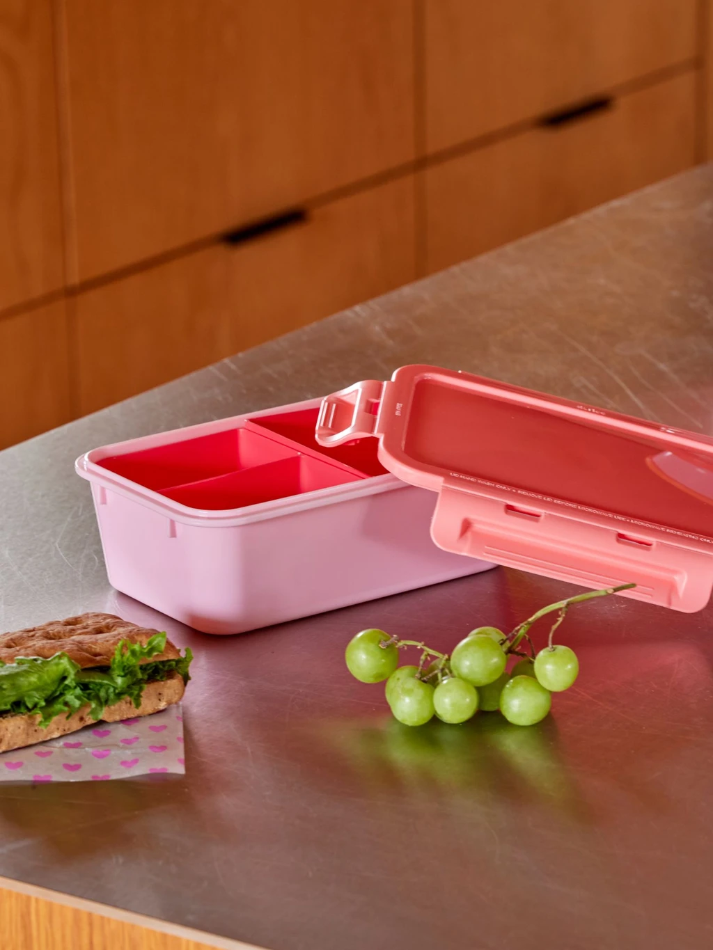 Make lunchtime even better with our cool, pink lunchbox! It features a pinkish colored lid and three changeable compartments in red – perfect for keeping your meals organized and fresh! Want to add a personal touch? Decorate it with our fun lunch box stickers! Remember, the lid should be removed before microwave use