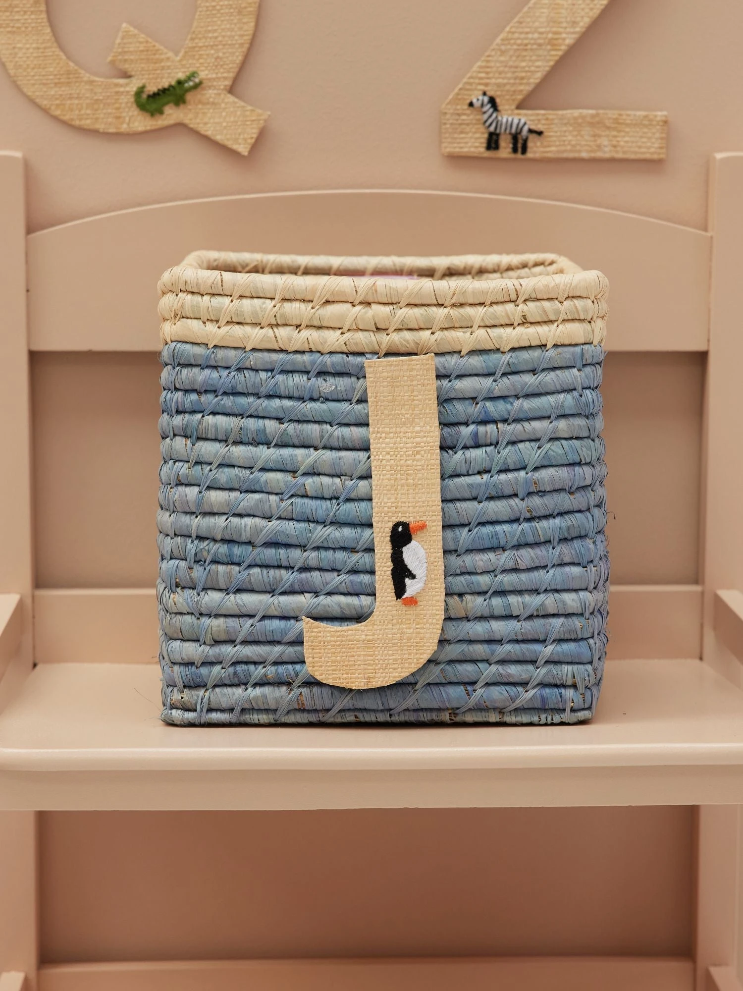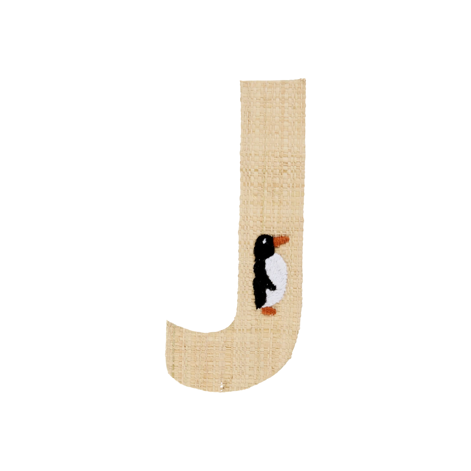 Super cute J in natural colored raffia with a small, embroidered penguin. Our raffia letters have a sticky backside, so you can hang them anywhere you want… doors, closets or even raffia baskets! Mix and match the letters and write whatever you want… or assign each family member their own basket in the hallway – the sky is the limit. The letters are handmade from the natural and sustainable material raffia, so you will never find two identical letters – isn’t that just charming?!