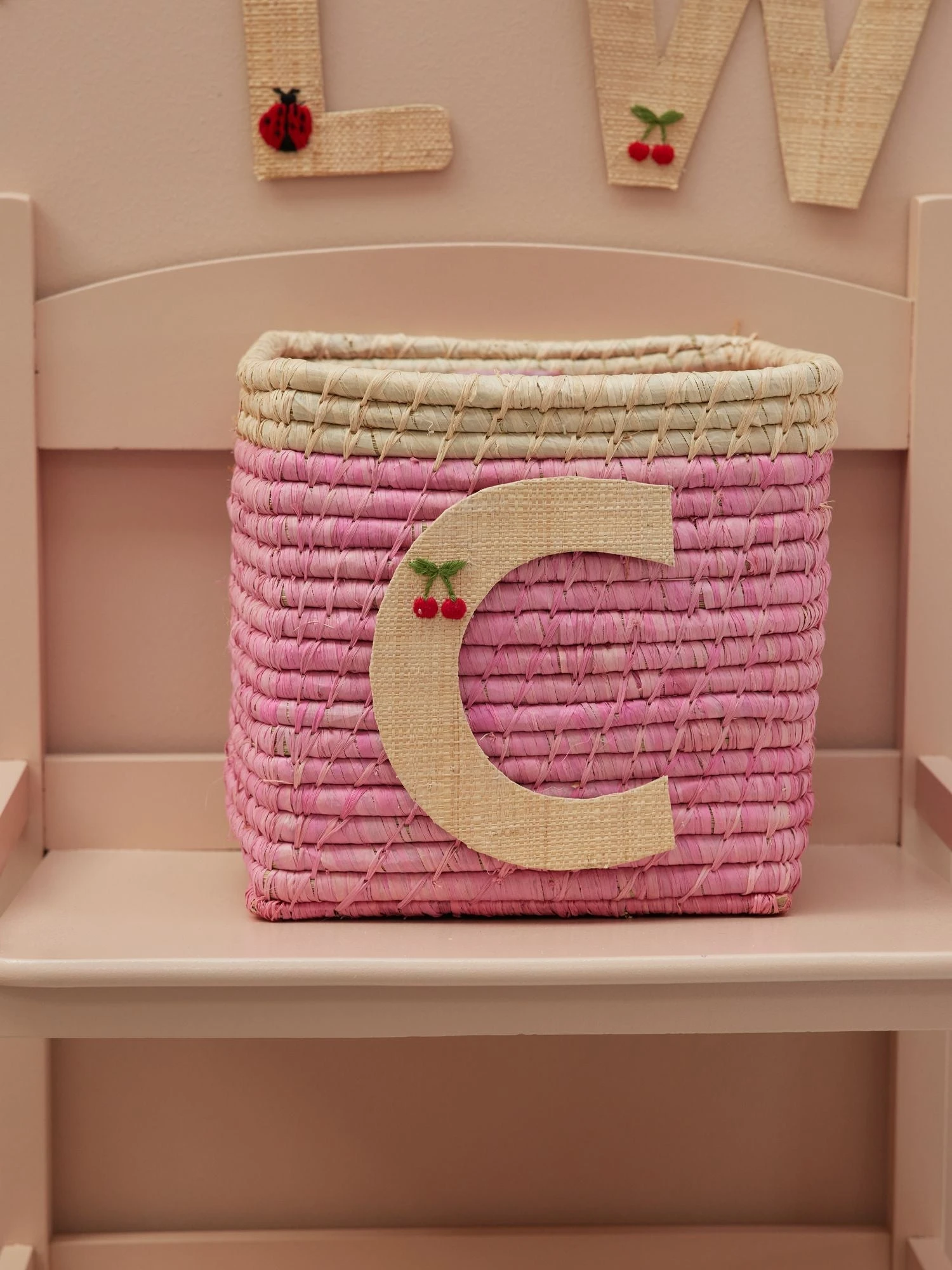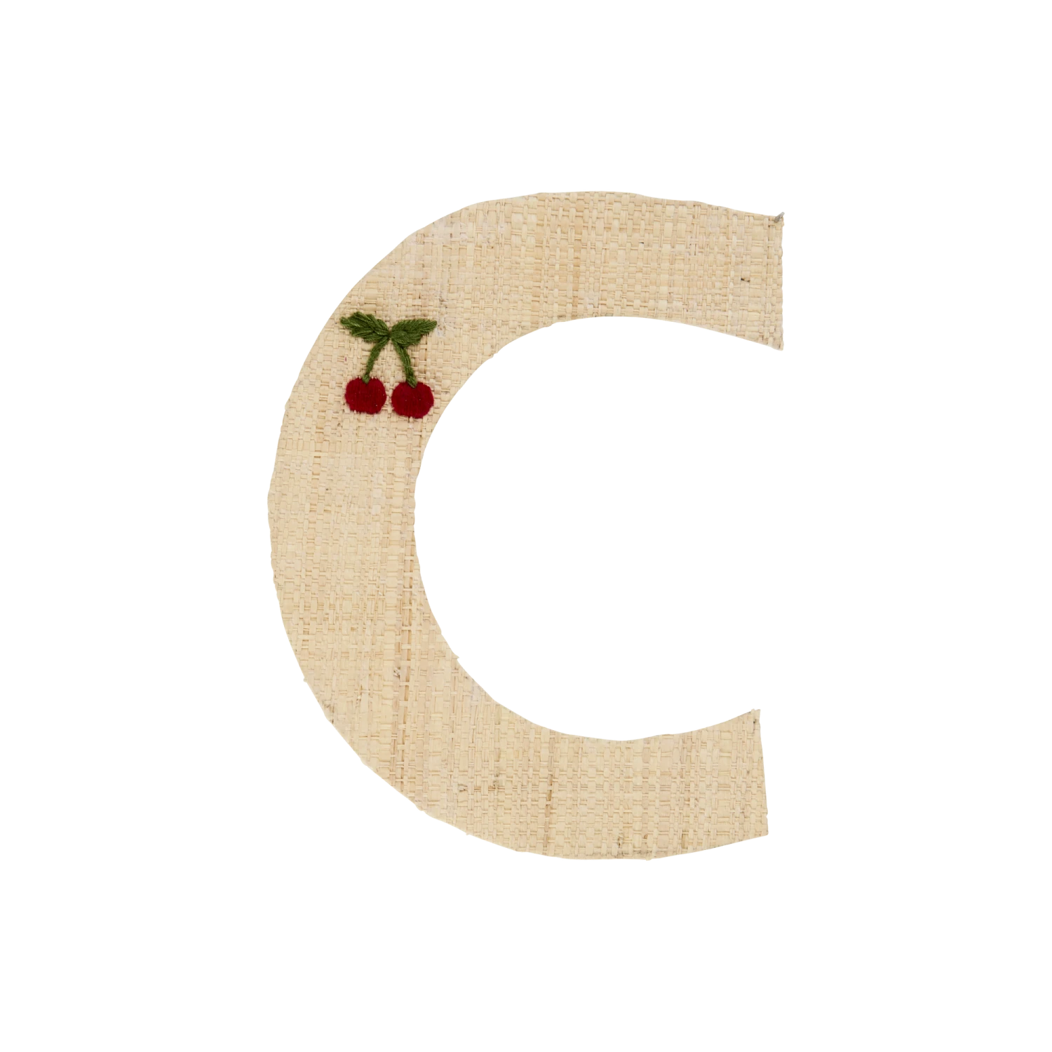 Super cute C in natural colored raffia with a small, embroidered cherry. Our raffia letters have a sticky backside, so you can hang them anywhere you want… doors, closets or even raffia baskets! Mix and match the letters and write whatever you want… or assign each family member their own basket in the hallway – the sky is the limit. The letters are handmade from the natural and sustainable material raffia, so you will never find two identical letters – isn’t that just charming?!