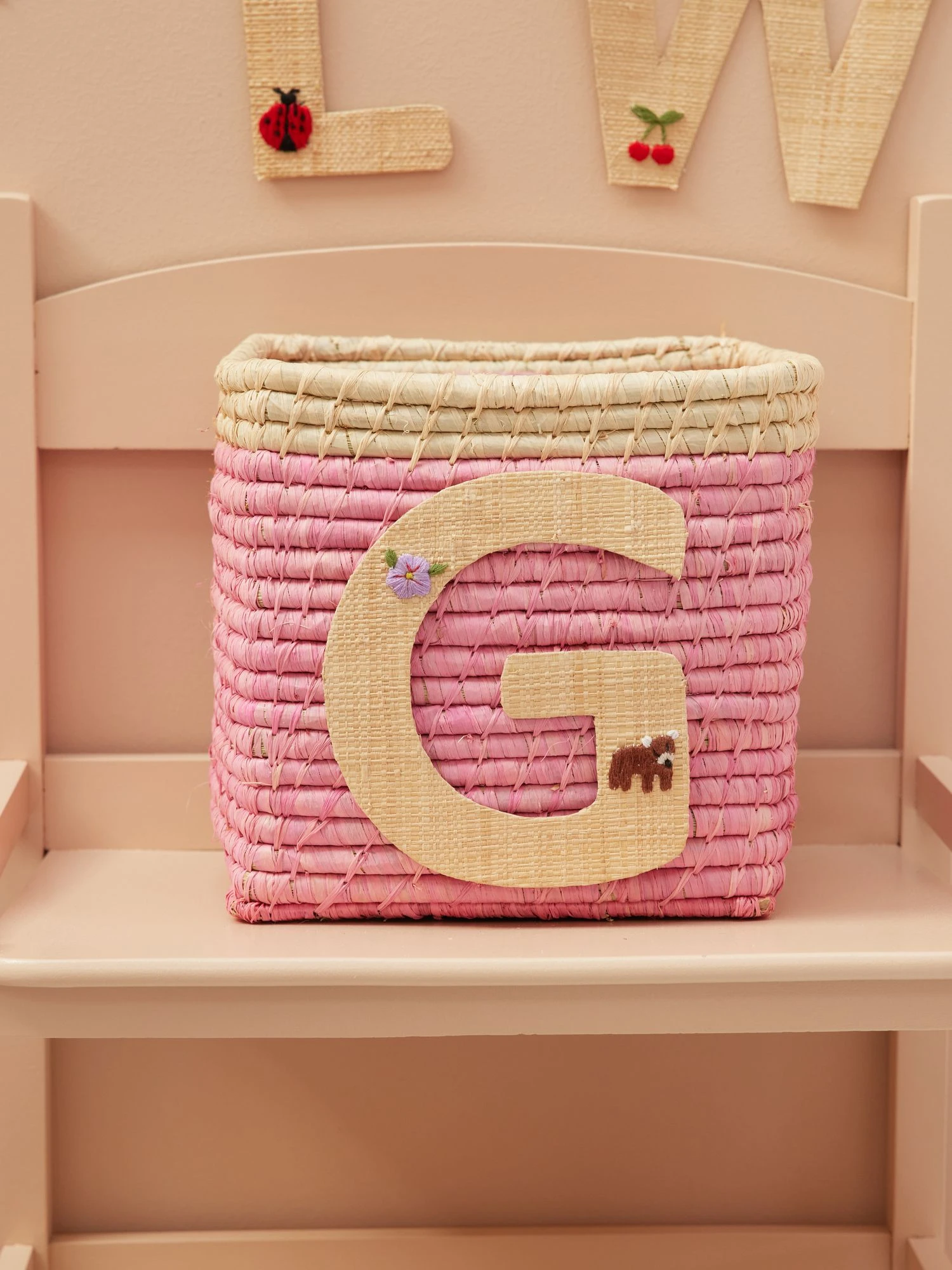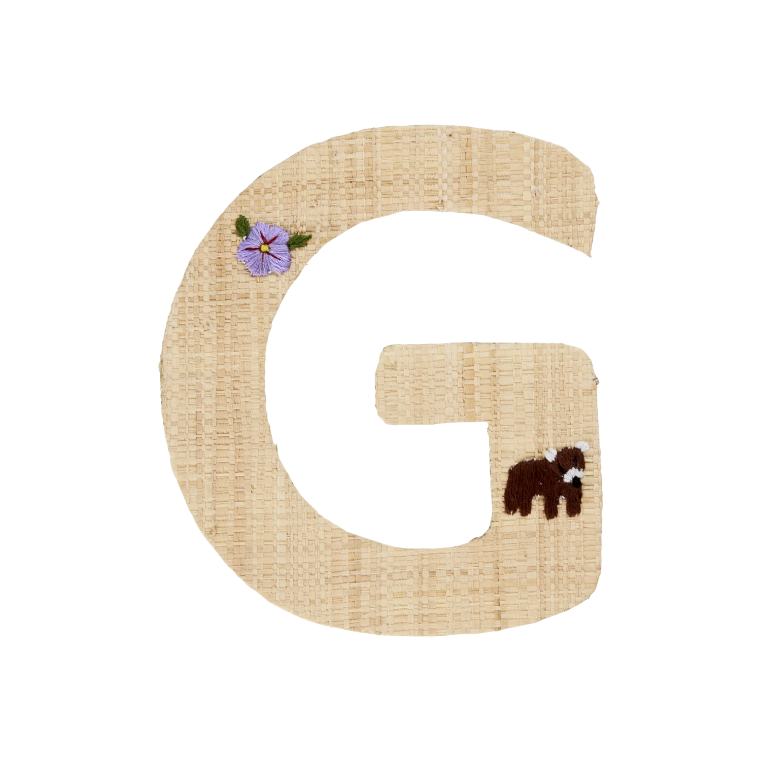 Super cute G in natural colored raffia with a small, embroidered flower. Our raffia letters have a sticky backside, so you can hang them anywhere you want… doors, closets or even raffia baskets! Mix and match the letters and write whatever you want… or assign each family member their own basket in the hallway – the sky is the limit. The letters are handmade from the natural and sustainable material raffia, so you will never find two identical letters – isn’t that just charming?!