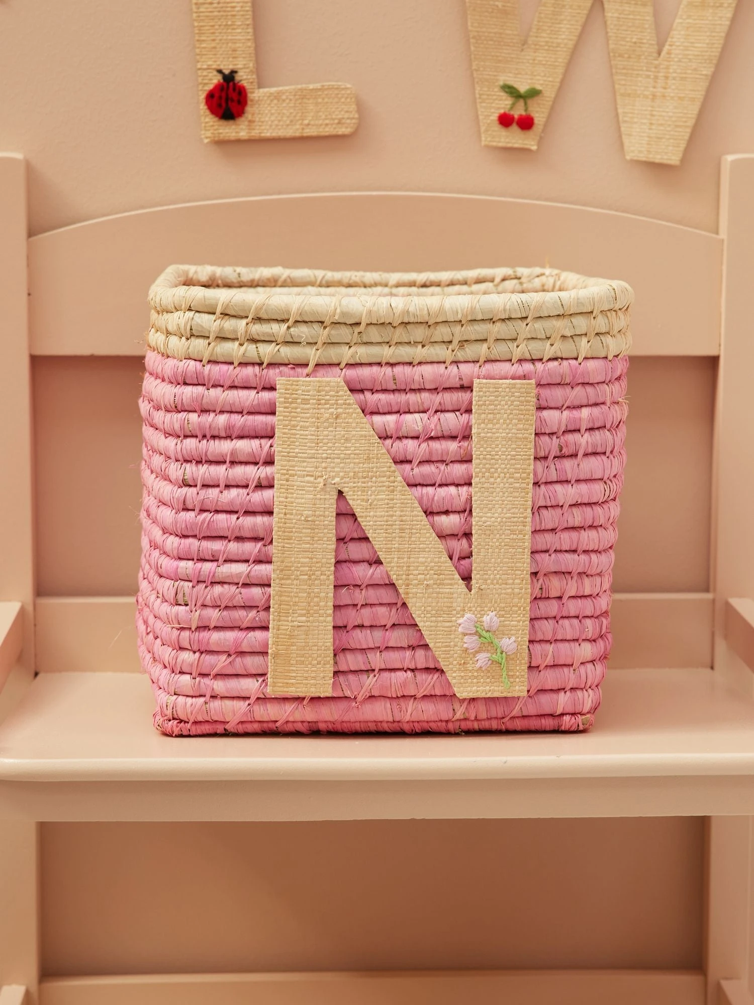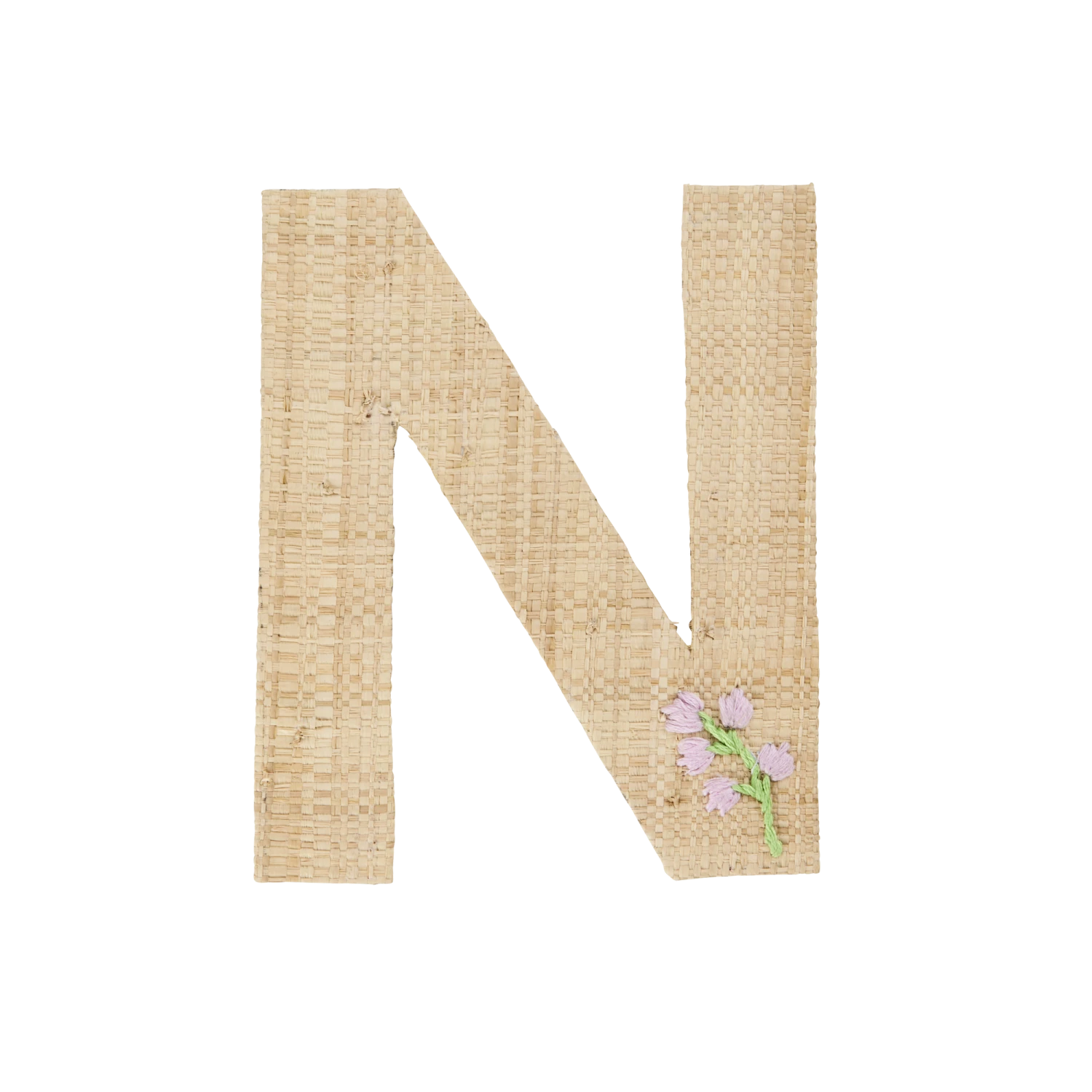 Super cute N in natural colored raffia with a small, embroidered flower. Our raffia letters have a sticky backside, so you can hang them anywhere you want… doors, closets or even raffia baskets! Mix and match the letters and write whatever you want… or assign each family member their own basket in the hallway – the sky is the limit. The letters are handmade from the natural and sustainable material raffia, so you will never find two identical letters – isn’t that just charming?!