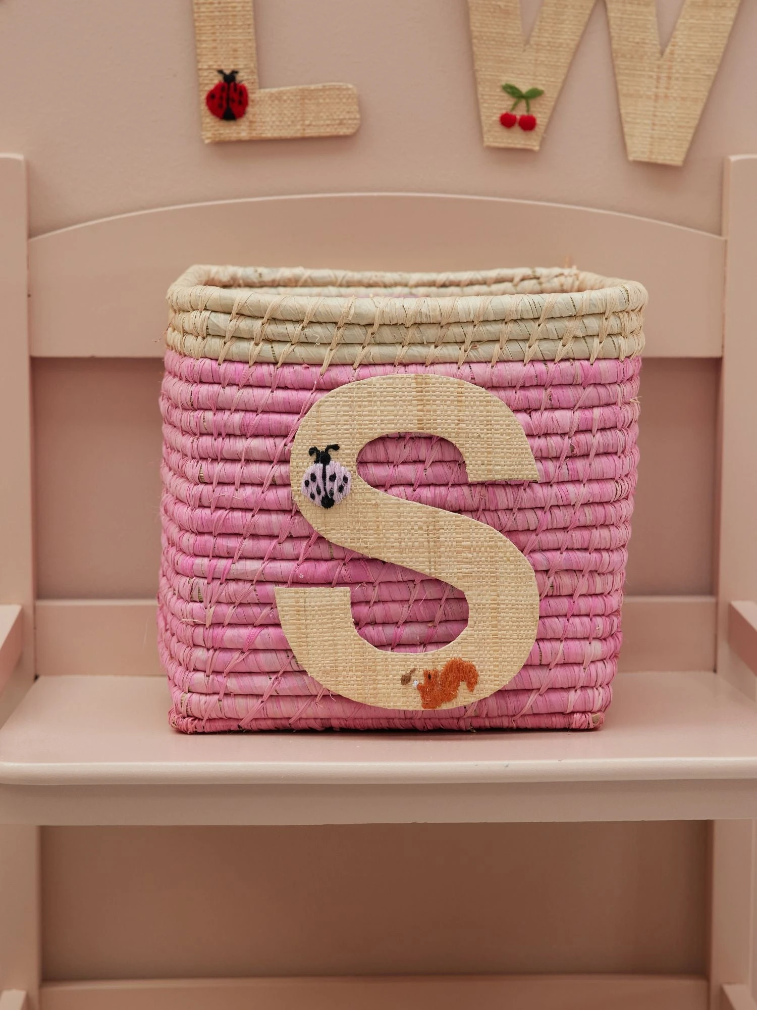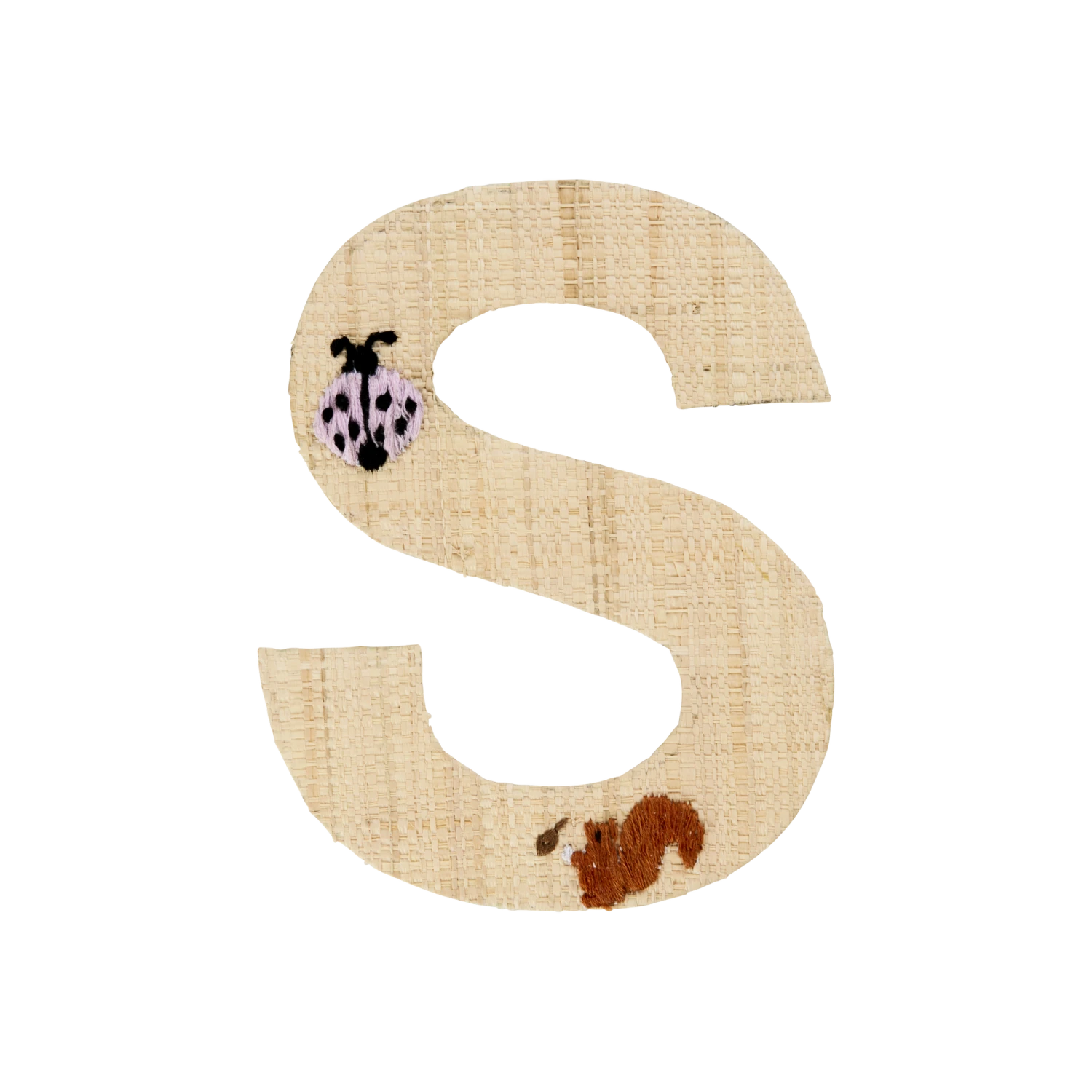 Super cute S in natural colored raffia with a small, embroidered lady bug. Our raffia letters have a sticky backside, so you can hang them anywhere you want… doors, closets or even raffia baskets! Mix and match the letters and write whatever you want… or assign each family member their own basket in the hallway – the sky is the limit. The letters are handmade from the natural and sustainable material raffia, so you will never find two identical letters – isn’t that just charming?!