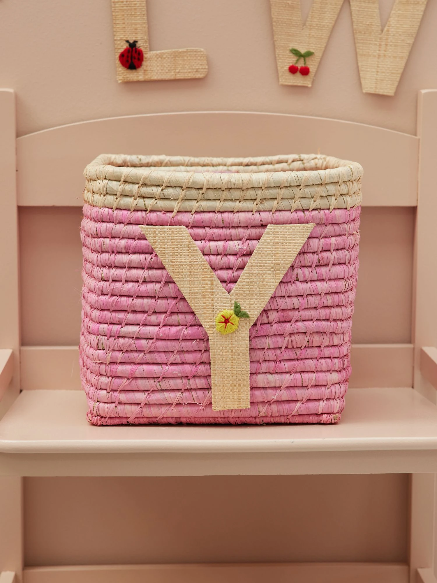 Super cute Y in natural colored raffia with a small, embroidered flower. Our raffia letters have a sticky backside, so you can hang them anywhere you want… doors, closets or even raffia baskets! Mix and match the letters and write whatever you want… or assign each family member their own basket in the hallway – the sky is the limit. The letters are handmade from the natural and sustainable material raffia, so you will never find two identical letters – isn’t that just charming?!