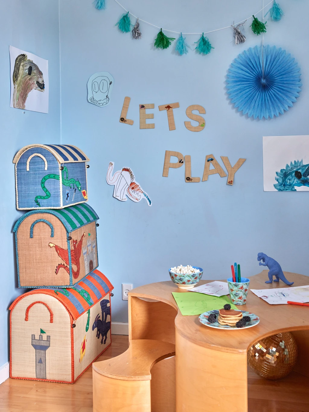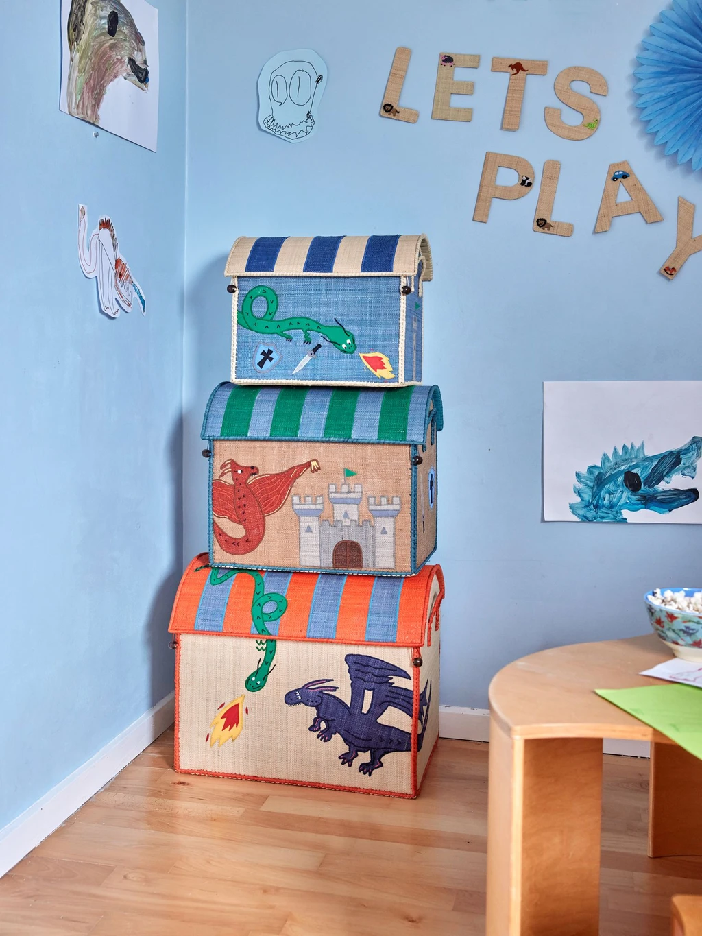 Raffia storage baskets in dragon theme. It is almost like being back in time! The set contains a large, a medium and a small basket. These baskets with lids are made in a natural material and are perfect for storage in the kids room, for shoes in the hallway or the living room where you don’t want too much to show. Sold in sets of three.