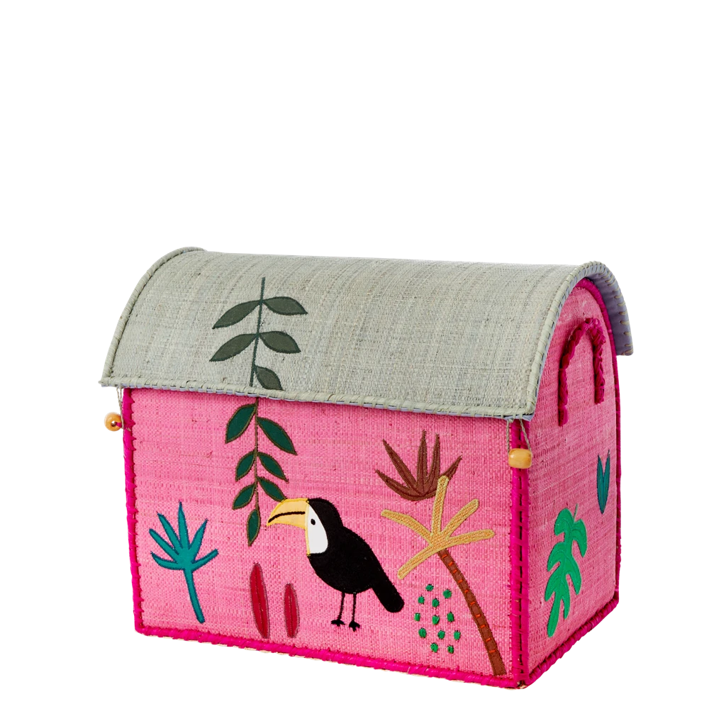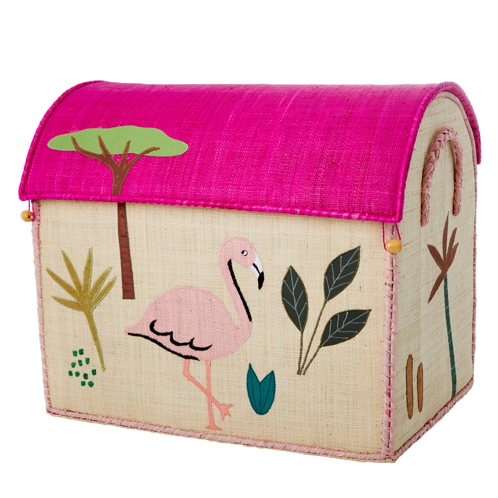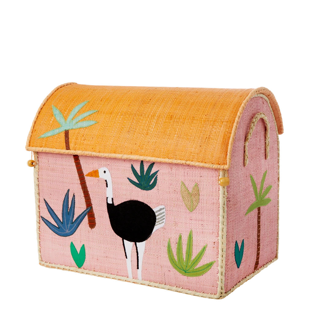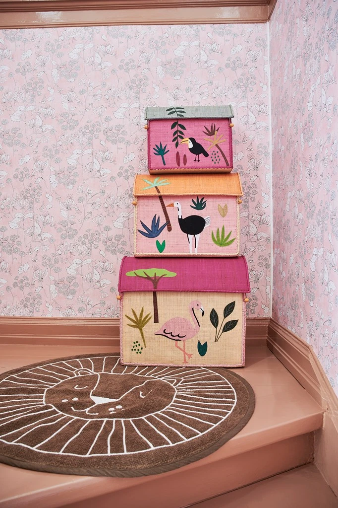 Beautiful hand made storage baskets in raffia with assorted Jungle Pink Theme – indispensable for storing toys in the kids room.