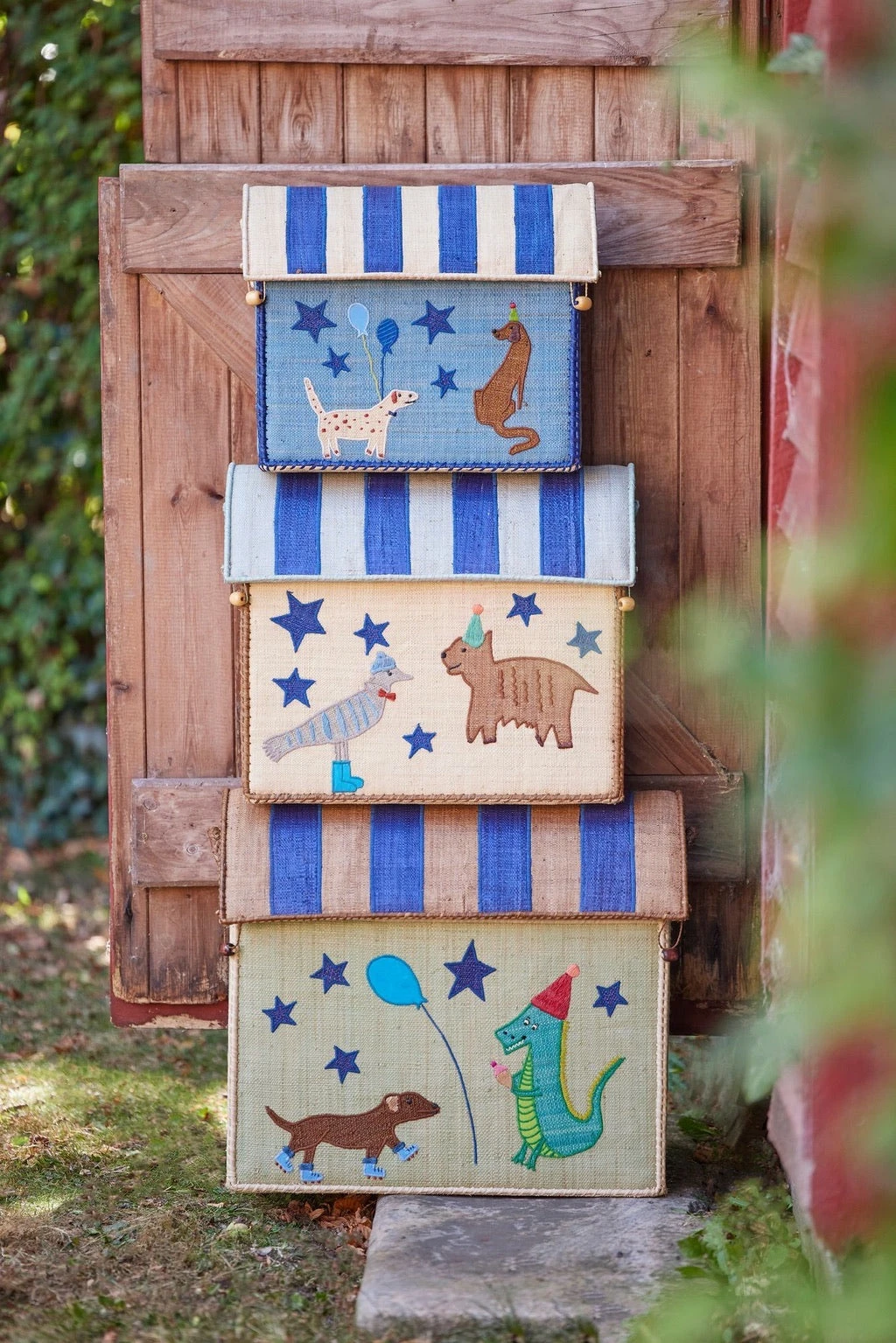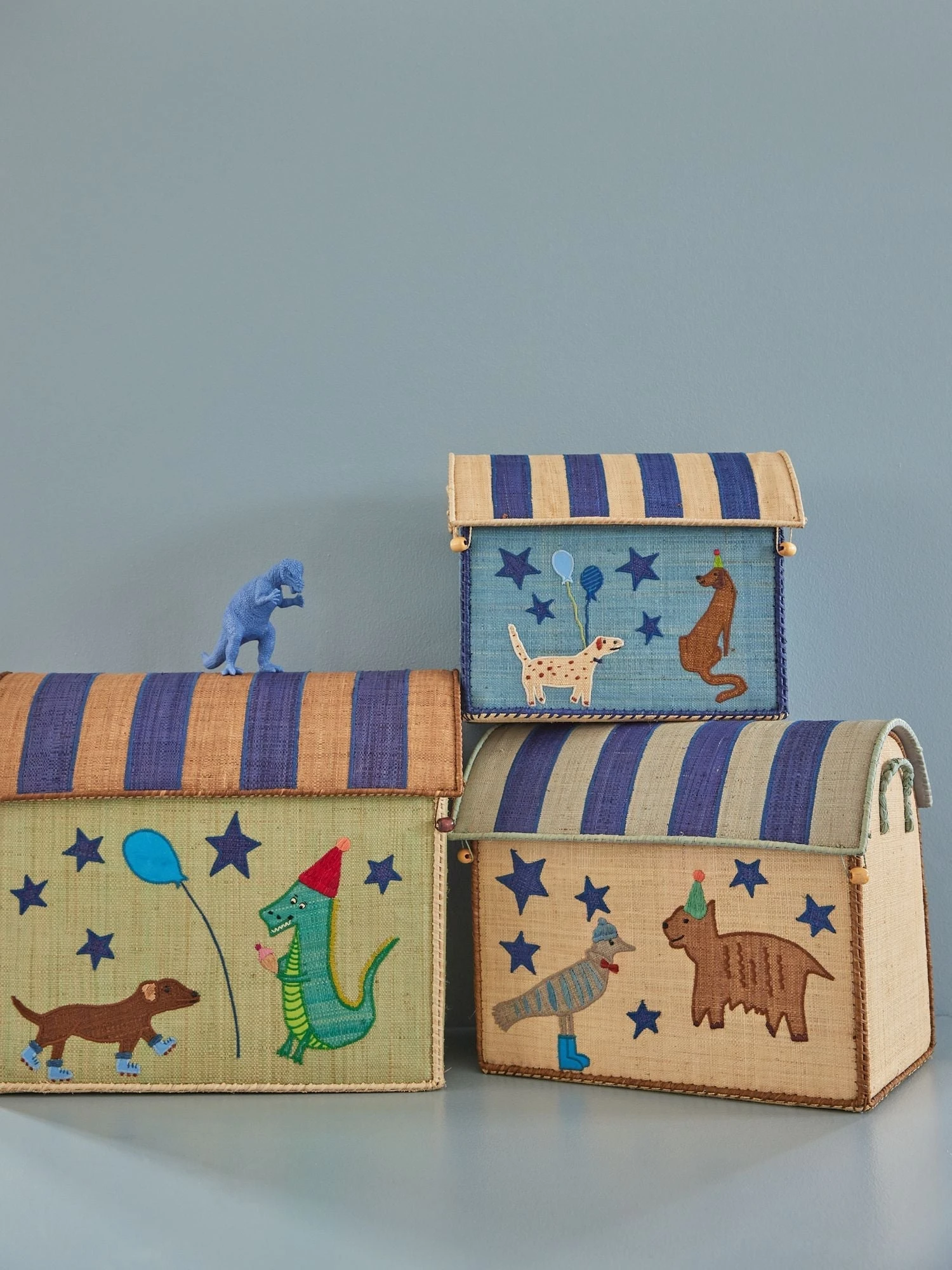 Raffia storage baskets in blue shades with cute party animals. You almost feel like celebrating yourself! The set contains a large, a medium and a small basket. The baskets are made in a natural and sustainable material and are perfect for storage in the kids room, for shoes in the hallway or the living room where you don’t want too much to show. Sold in sets of three.