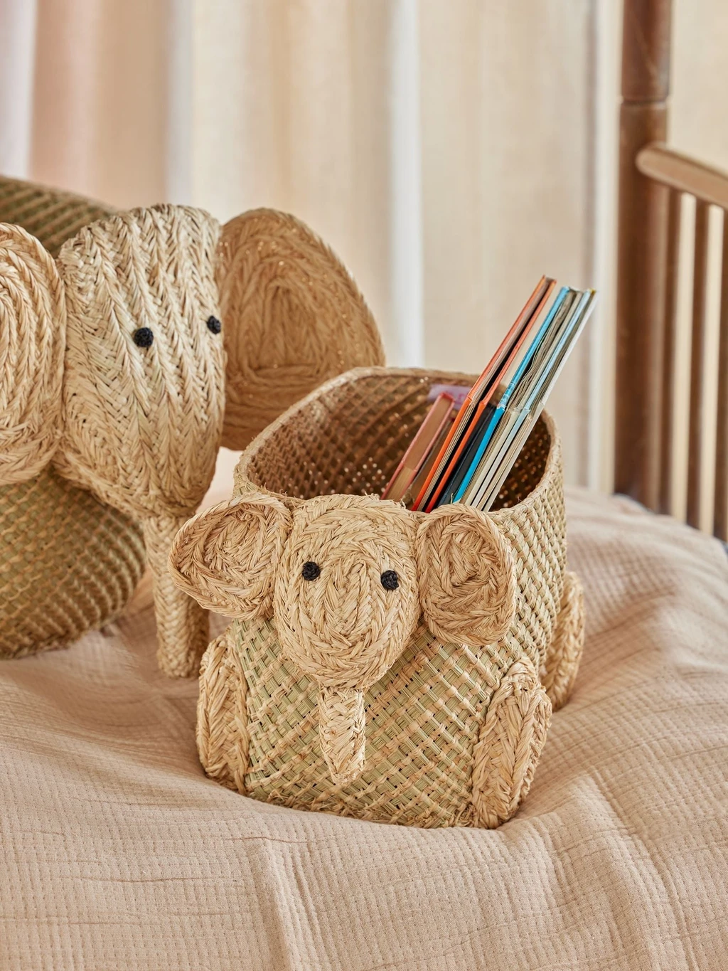 How cute is this? A small, handmade storage basket shaped like an elephant. We absolutely love it! The basket is handwoven in the sustainable materials seagrass and raffia – and will for sure look good in any setting. Fill it with all your favorite things… blankets, cushions, toys or maybe even a beautiful plant. The basket also comes in a larger size and in other cute animal shapes.