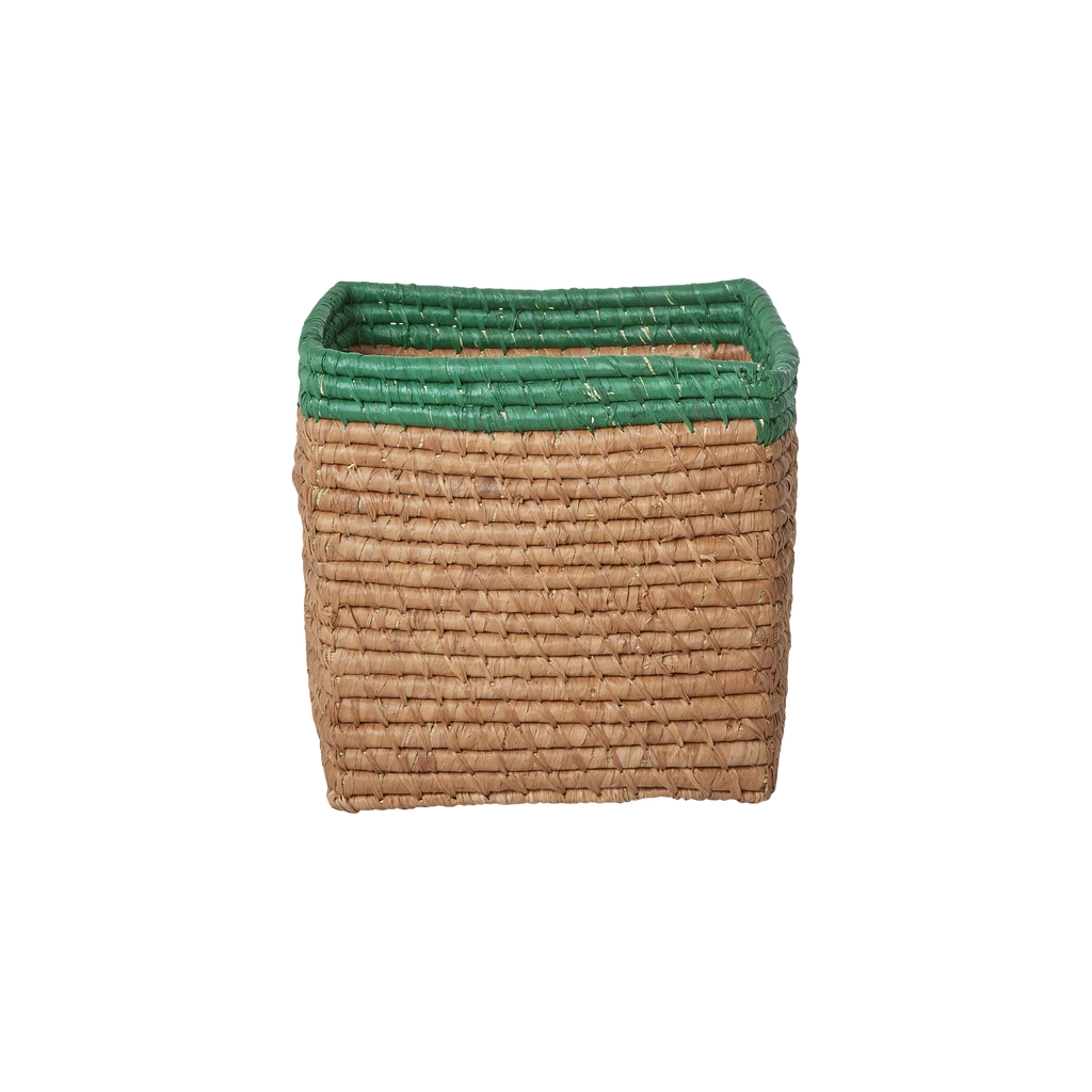 Beautiful, handmade raffia basket in tea with a green top – a true classic! The square basket measures L20 cm (7.8 in) x W20 (7.8 in) cm x H20 cm (7.8 in)… Excellent to store the small and bigger things of everyday life… Personalize with the letter of your choosing! Everything from book and paper, to candles, napkins and other things… Use it to fit your exact need! Can be bought in many beautiful colors – some even with embroidery and patterns. Spacious and fits plenty of things… Besides being cute and practical, it is handmade of raffia – and as it so, no two products will ever be the same, which we think is part of the charm. The colors will fade a bit over time and more quickly if they are placed in direct sunlight. Avoid contact with water as the colors can rub off.